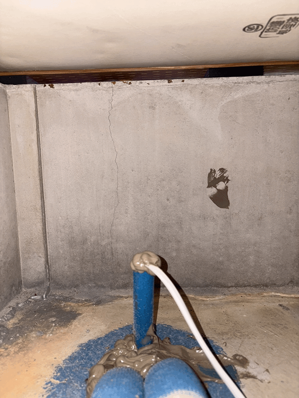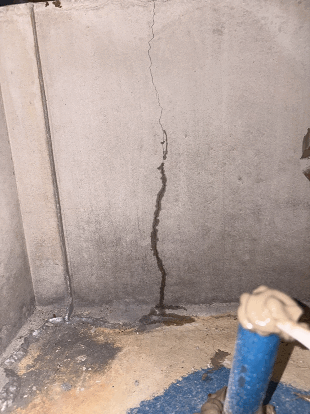 今回基礎のクラックを発見しました。基礎の外側と内側で同じような場所にクラックが発生していたため外側から水をかけて確認してみたところ、内側まで漏水していることが確認されました。貫通クラックでした。クラックの幅は0.25から0.35ミリ程度です